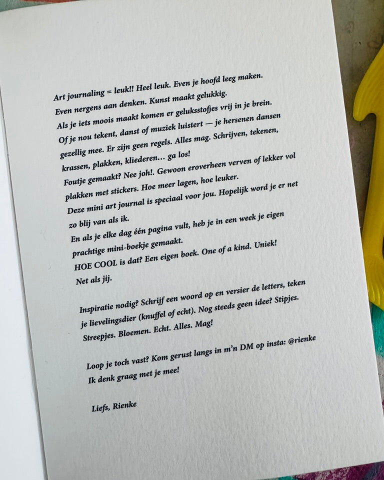 Het boekje heeft 8 pagina’s van mooi dik papier, geschikt voor waterverf, potlood, stift en collage. Er zijn geen regels en geen fouten. Alles mag. Elke pagina nodigt je uit om te beginnen, precies waar je bent.